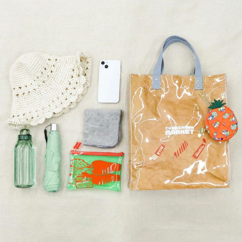 タイベックとクリア生地をかさねた、透け感と遊び心のあるクラフトトートバッグ。