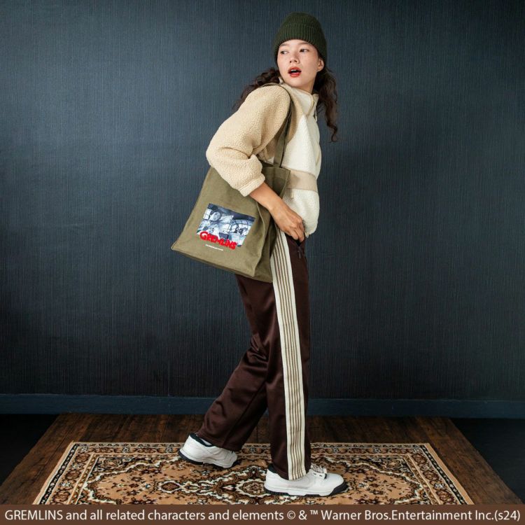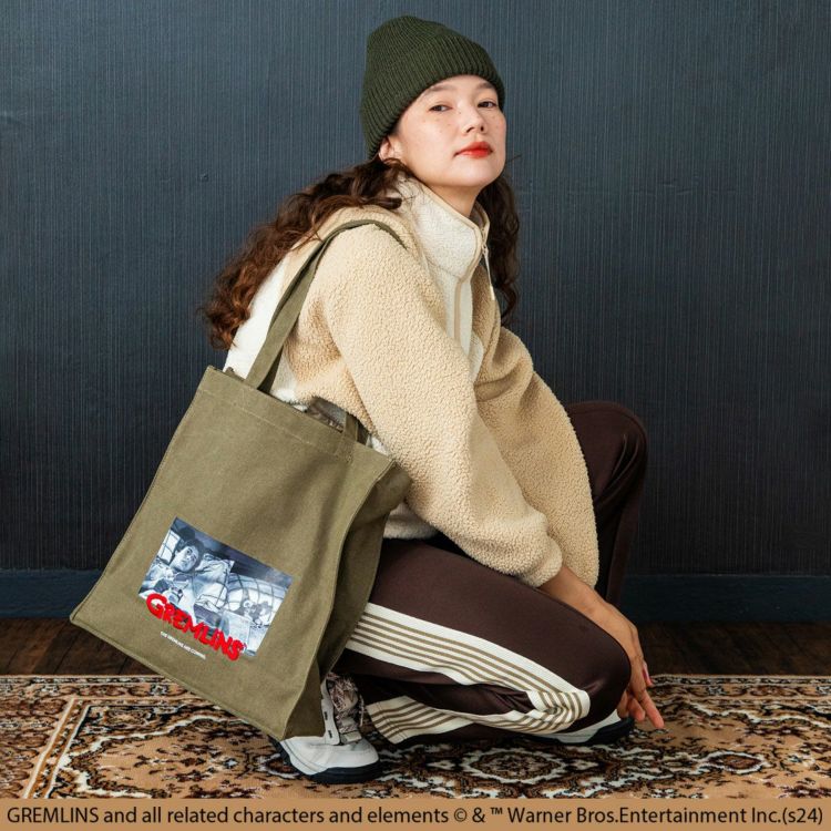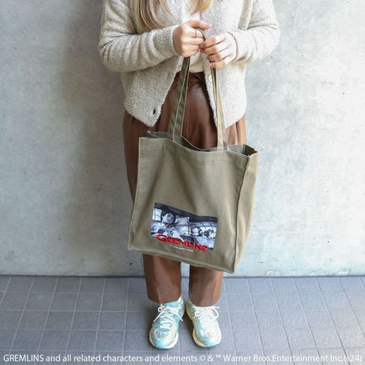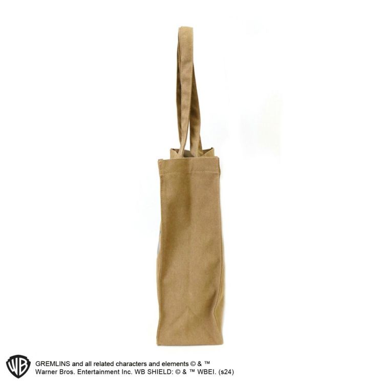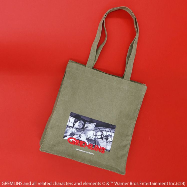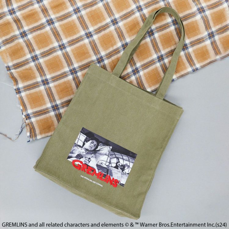 ウォッシュキャンバス生地に映画「グレムリン(GREMLINS)」の印象的なシーンをプリントしたマチありトートバッグ。