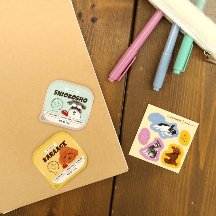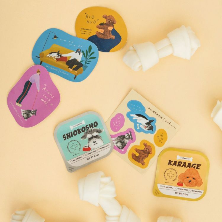 ドッグフード2種と小さめのハーフカットスステッカーのセット。